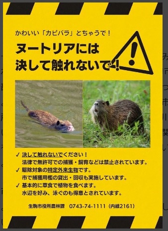 奈良県生駒市は特定外来生物ヌートリアへの注意を呼びかけるチラシを作り、市のホームページに掲載している。