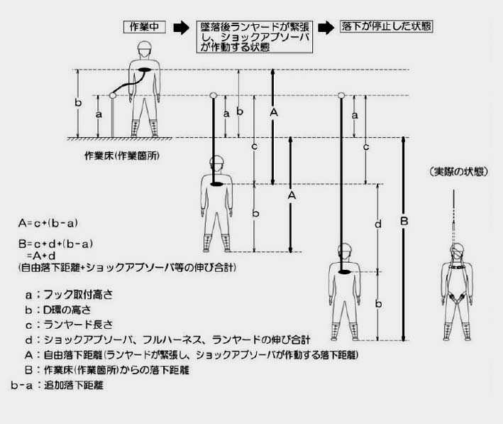 作業者がフルハーネス又は胴ベルトを着用する場合における、当該フルハーネス又は胴ベルトに、ランヤードを接続する部分の高さからフック等の取付設備等の高さを減じたものに、ランヤードの長さを加えたものをいう。(図のA)
